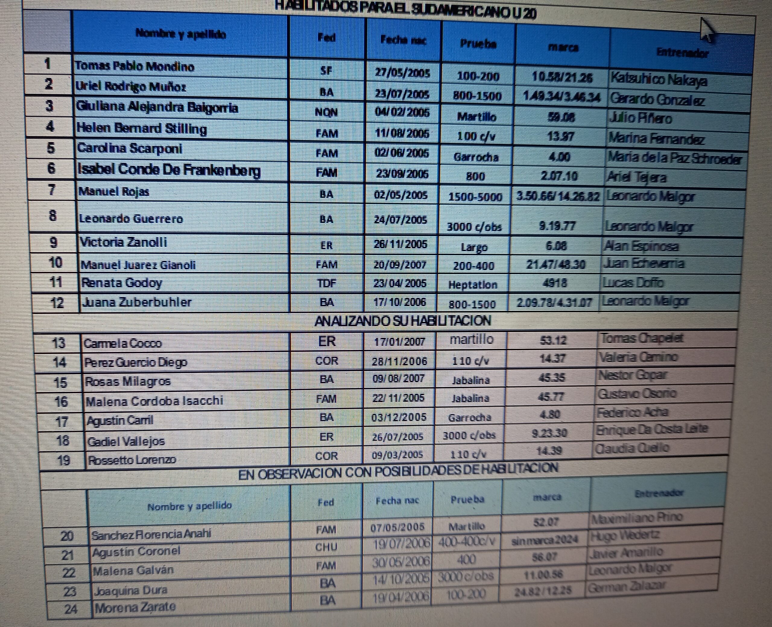 El rafaelino Tomás Mondino -que además tiene marca para el Mundial U20- es uno de los 12 atletas ya habilitados para ser parte del Sudamericano. No obstante, hay otros siete que la CADA denomina «Analizando su habilitación» y finalmente otro grupo de cinco deportistas en un bloque «En observación con posibilidades de habilitación».