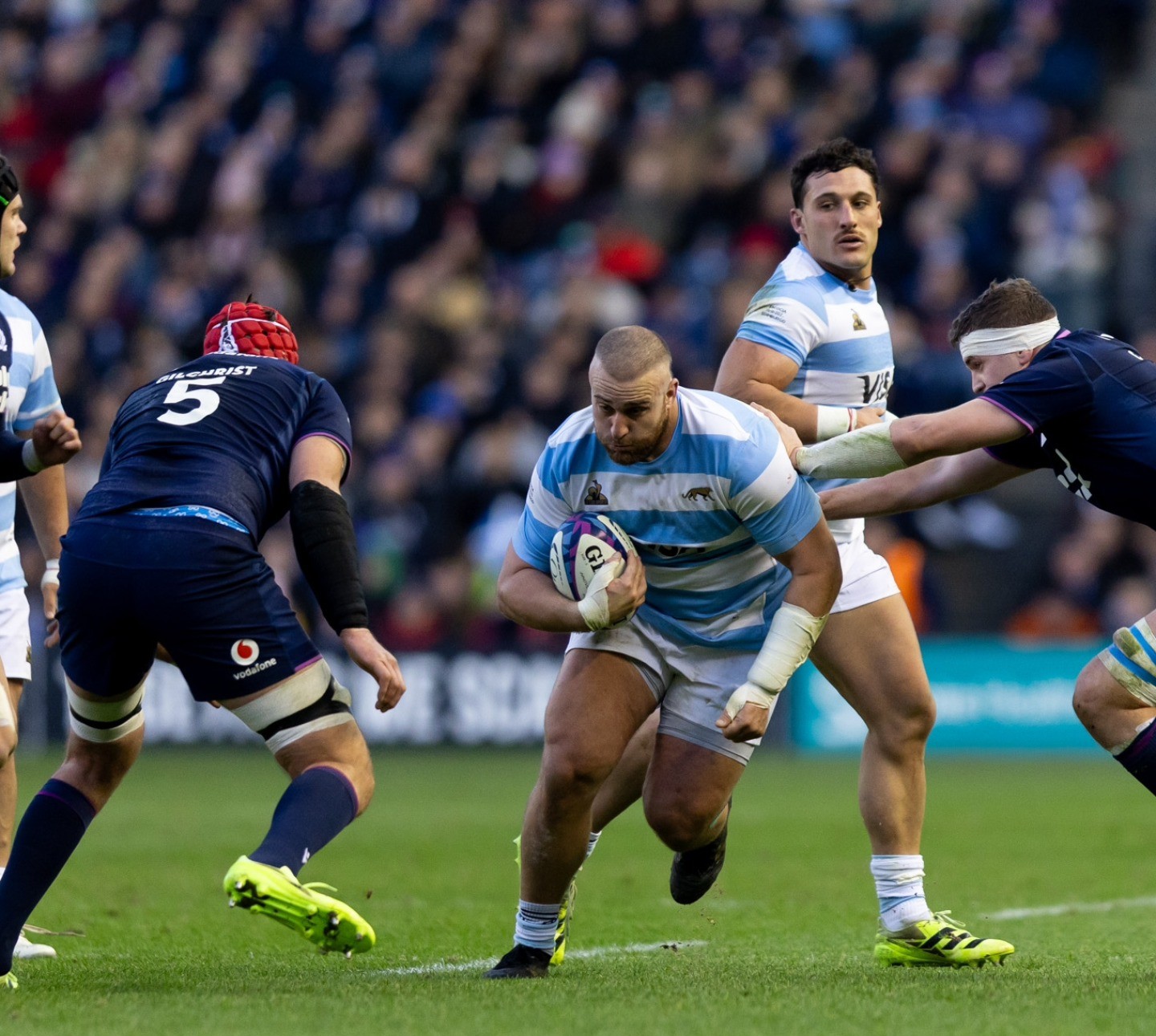 La reacción argentina se concretó a los 14 minutos del complemento, cuando el capitán Julián Montoya apoyó el primer try albiceleste, confirmado por el TMO. Envalentonados, Los Pumas volvieron a atacar y, apenas tres minutos después, Rodrigo Isgró encontró un claro para marcar un nuevo try. El Cardo respondió a los 23 minutos con un penal convertido por Finn Russell desde media distancia.