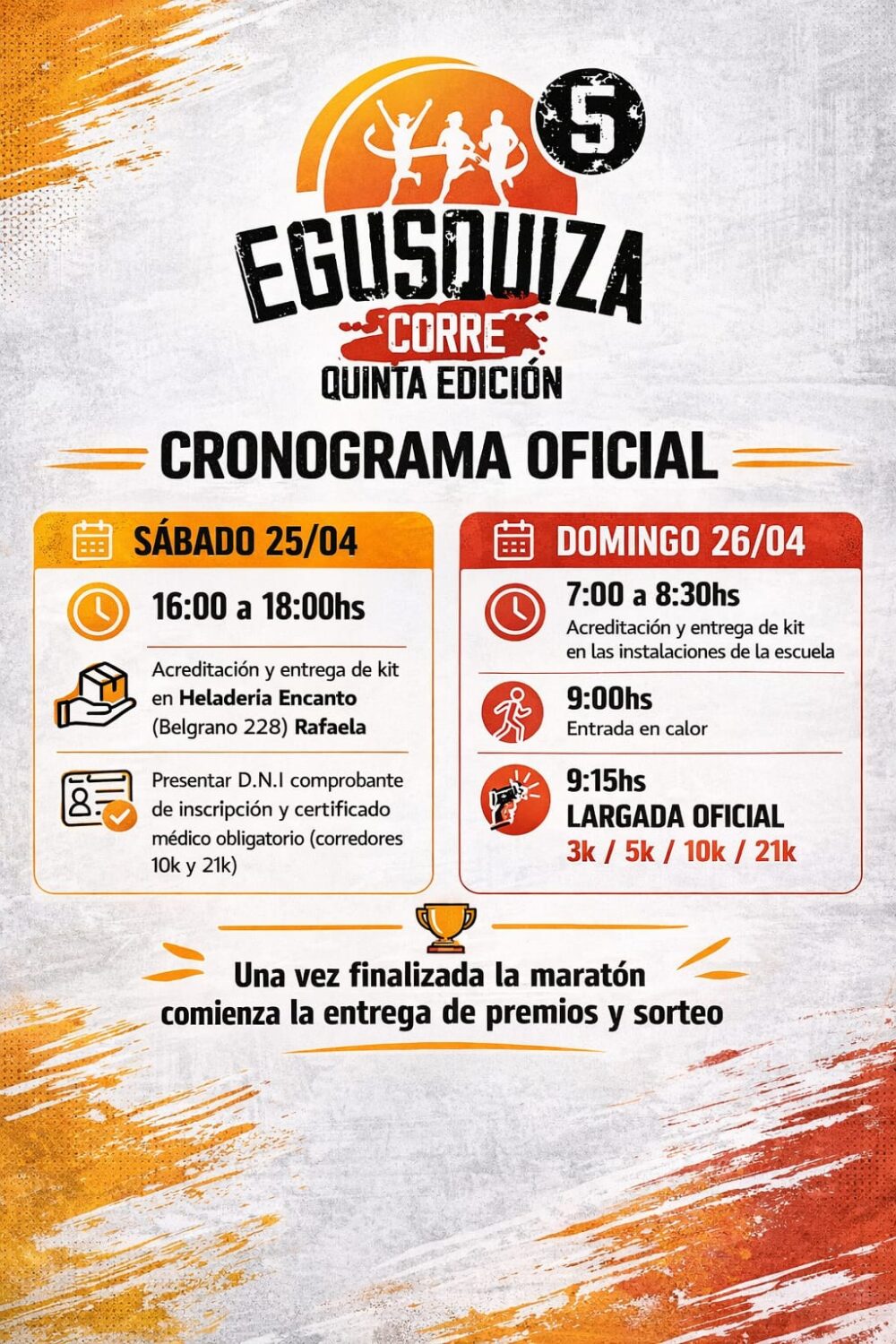 La entrada en calor será desde las 9 horas, mientras que a las 9.15 está prevista la largada. Cabe mencionar que en la posterior premiación se realizarán sorteos.