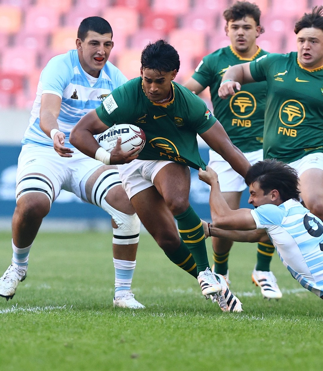 Ya de movida los Baby Boks marcaron diferencias en el juego con sus fortalezas físicas y con su juego arrollador. Y a los dos minutos abrieron el marcador con el try de Ethan Adams.
